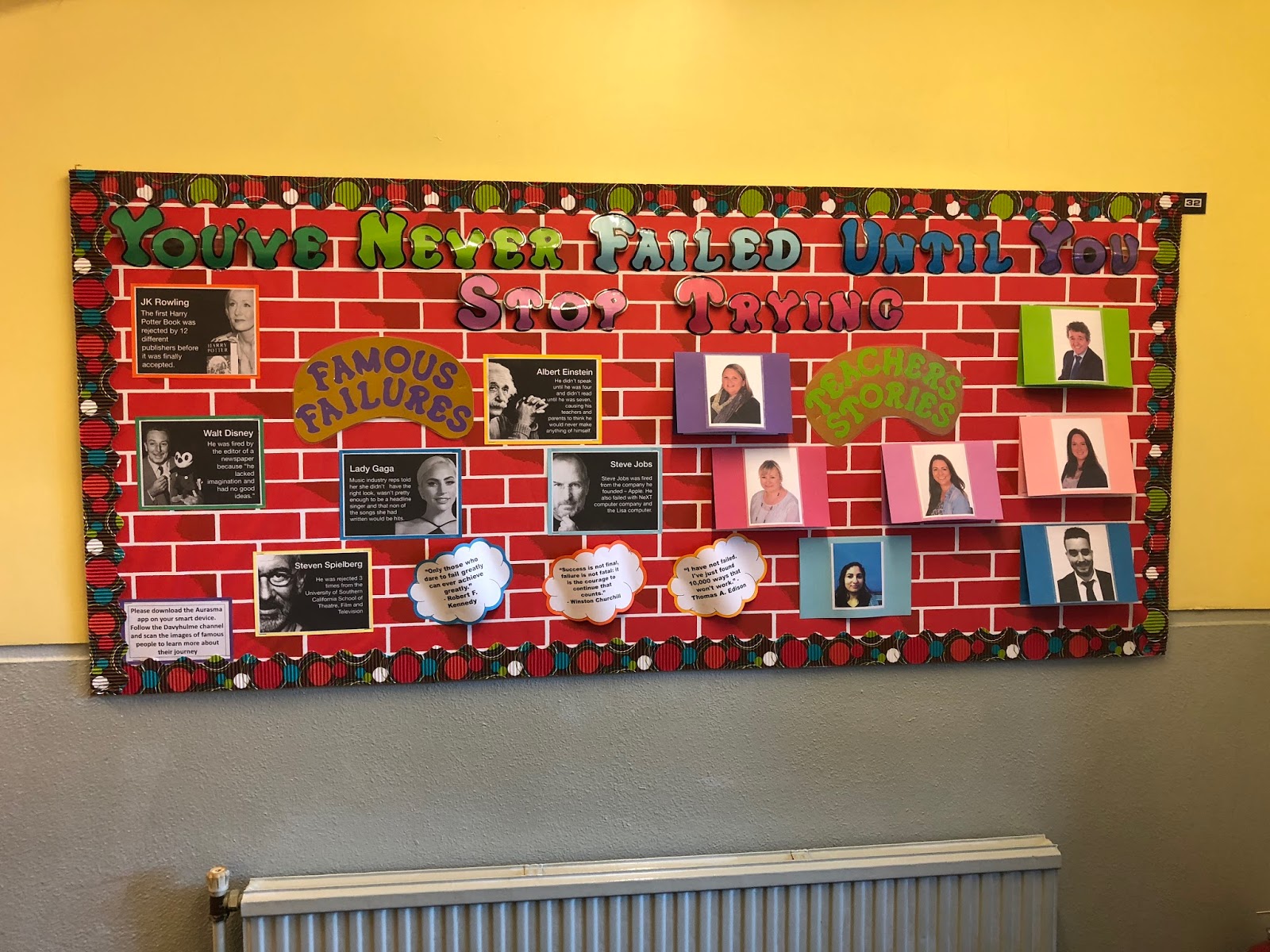 The idea was inspired by something I saw at Candleby Lane School in Nottingham. They had a display featuring stories from teachers talking about how they have failed and how they overcame that failure. So we did the same, we asked teachers to share stories of times when they felt they had failed and how they worked through it and didn't let it stop them from achieving their goals. I feel this is a really powerful thing to share with our students to make them understand that everyone will have ups and downs including their teachers. Here is my example: